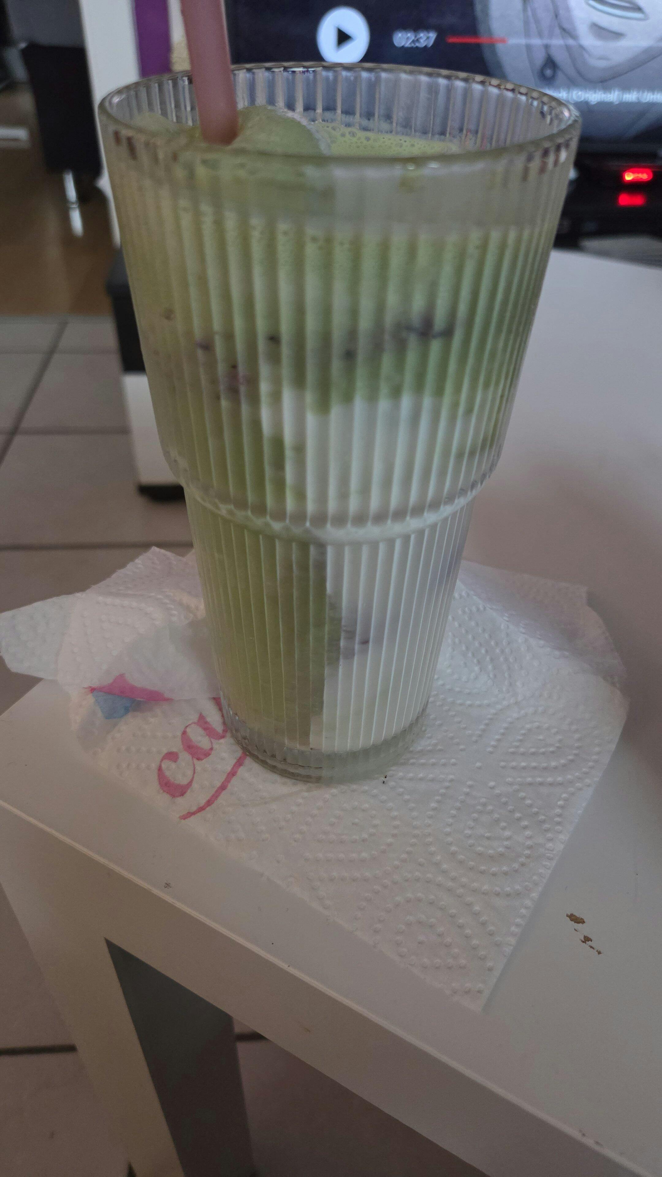 Anschließend Eiswürfel zugeben und mit 150ml (Hafer-)Milch aufgießen = perfekter Matcha Latte in Sekunden!