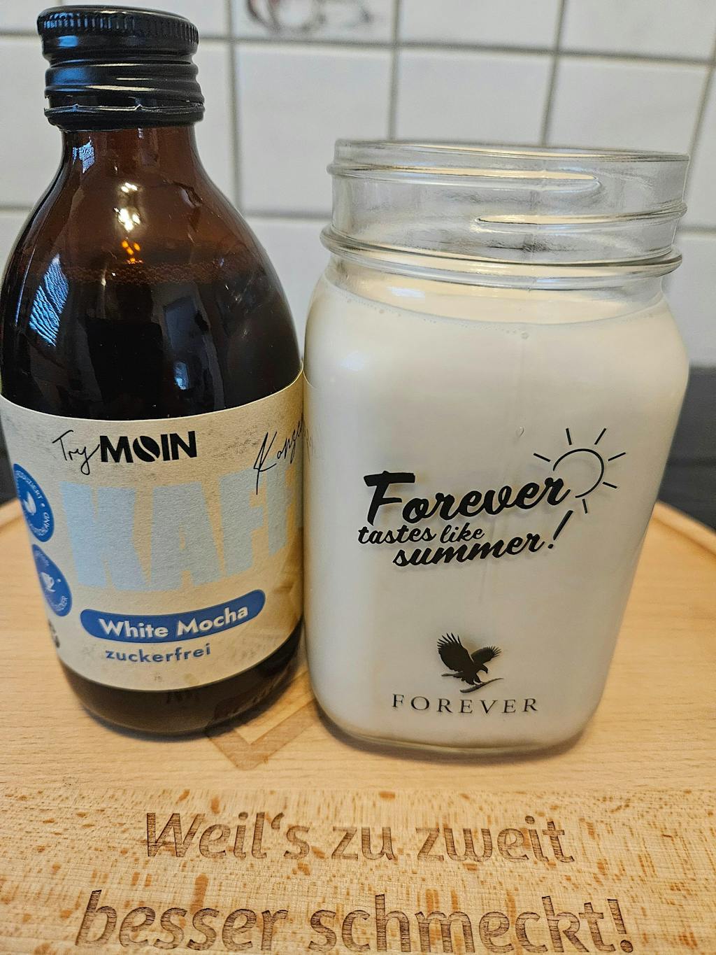 Glas mit Eiswürfeln und 200ml Milch (-alternative) füllen, 1-2 Löffel Moin dazu & genießen!